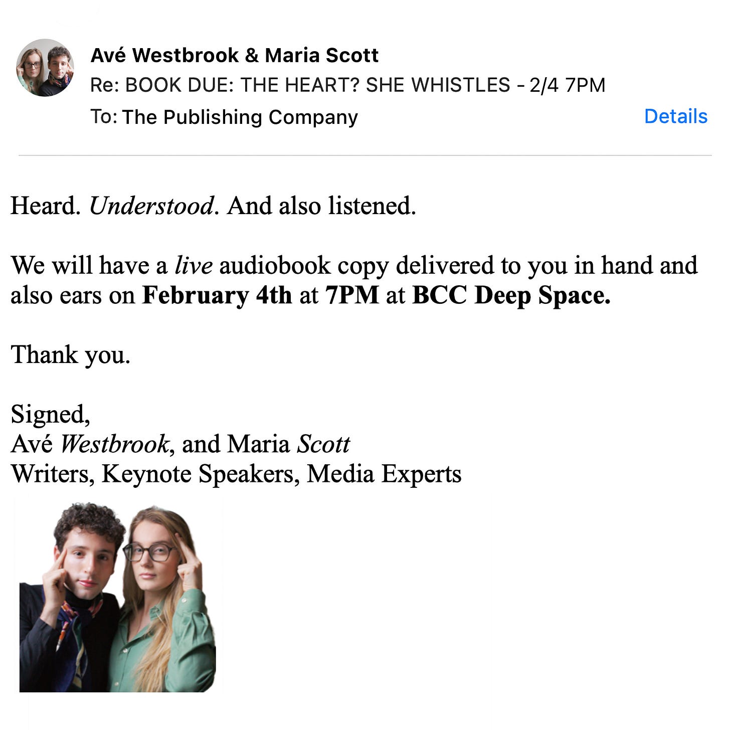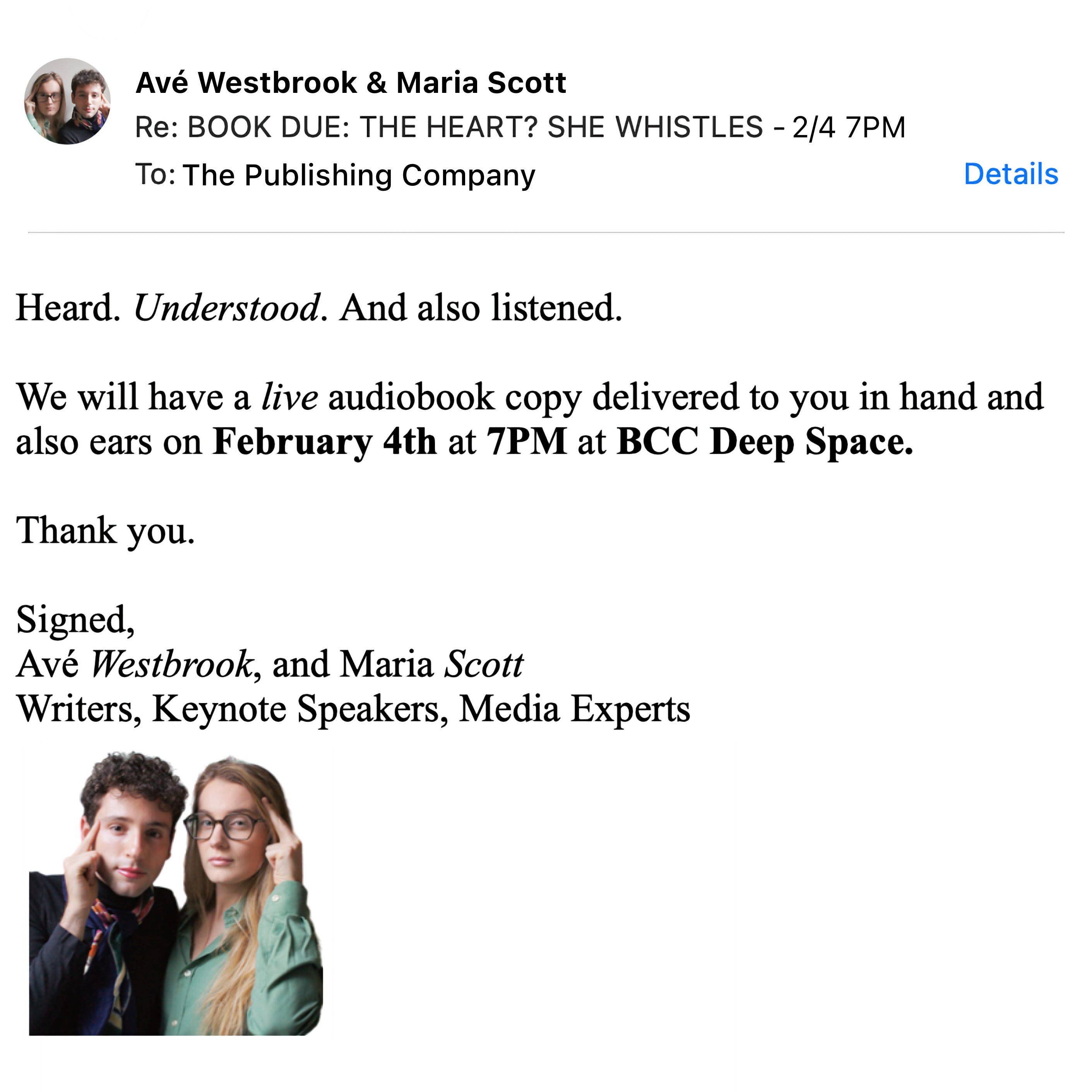 THE HEART? SHE WHISTLES LIVE AUDIOBOOK RECORDING - 2/4 at 7PM