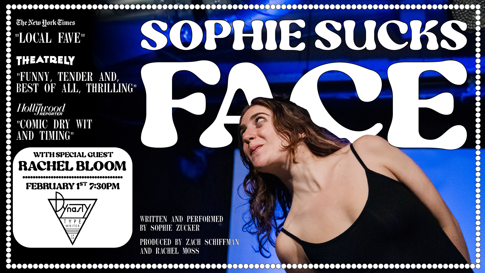 Yet another show I’ve written about, yet another person I am so earnestly obsessed with. In many (few) ways, next week is my residency at Dynasty Typewriter starting with me guesting again on Lovett or Leave It again on the 26th, and finishing with the West Coast premiere of Sophie Sucks Face. Theatrely gave our little incest musical a rave review, and I couldn’t ask for a better endorsement. Sophie has RACHEL BLOOM literally opening for HER! Get a ticket before we embark on our world tour.